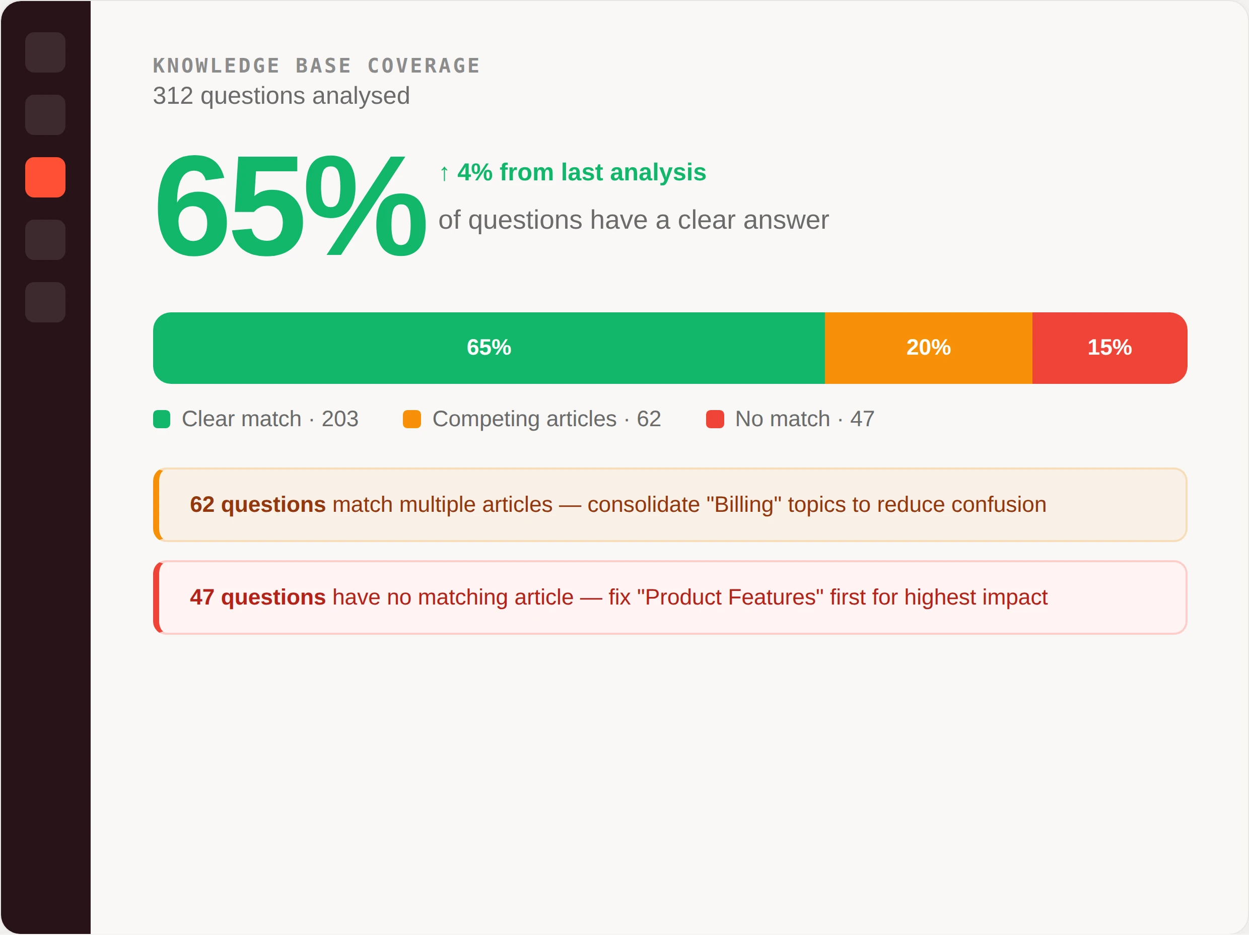 Comprendly continuously compares real customer questions to your knowledge base, surfacing what’s missing, outdated, or inconsistent.